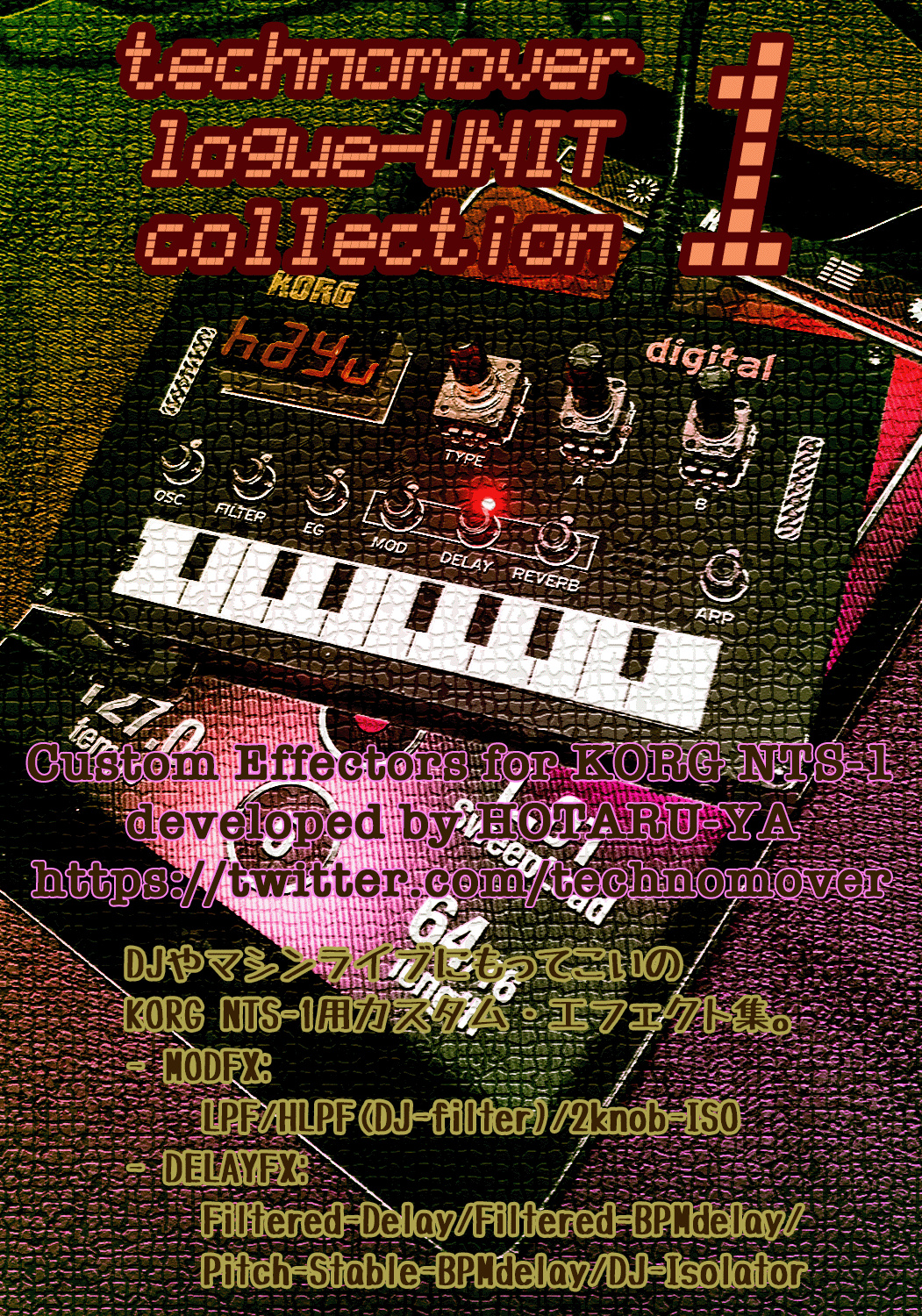 DJやマシンライブにもってこいのKORG NTS-1用カスタム・エフェクト集。 一発ループにDJフィルターとフィルター付きディレイをぐりぐり掛けるだけでも十分遊べます!