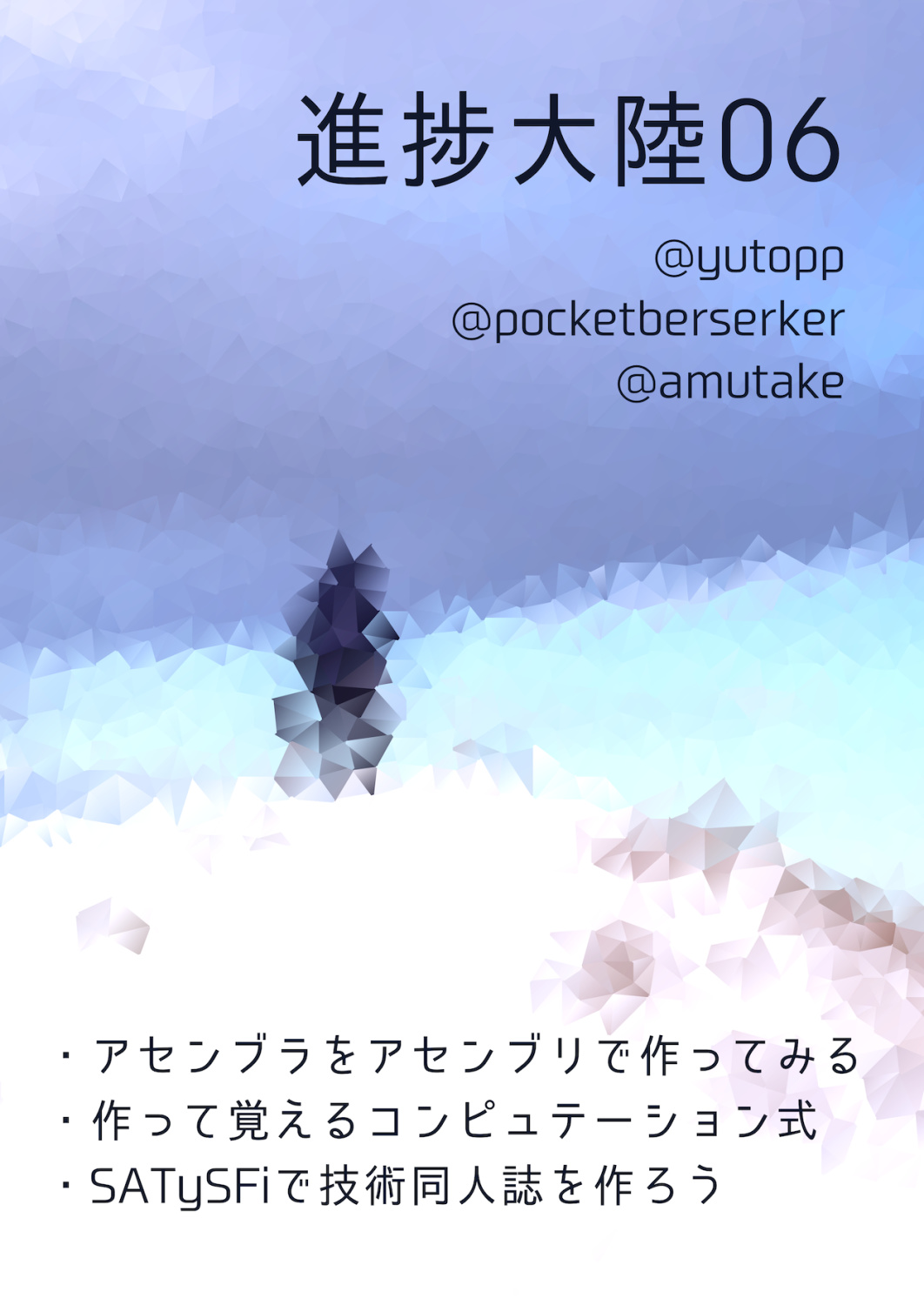 サークル進捗大陸としての6冊目の本です。今回は『アセンブラをアセンブリで作ってみる』『作って覚えるコンピュテーション式』『SATySFiで技術同人誌を作ろう』の三本立てとなっています。