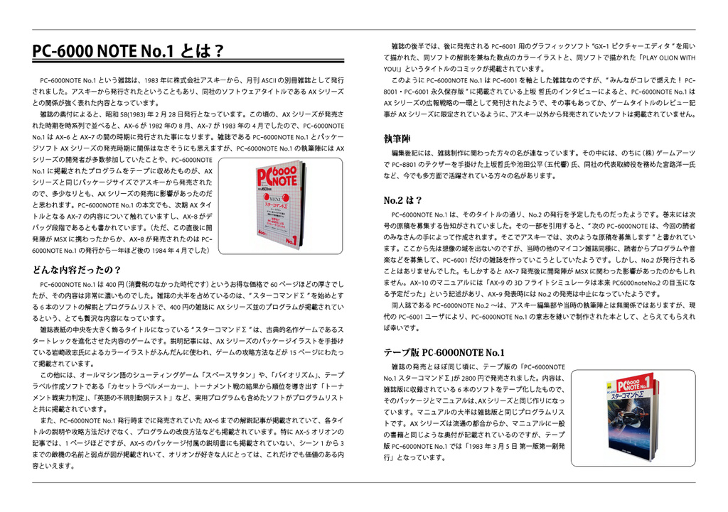アスキー出版が1983年に出版した「PC6000NOTE No.1」の内容と、P6同人誌の生い立ちについて軽く紹介しています。