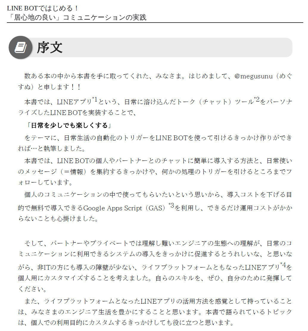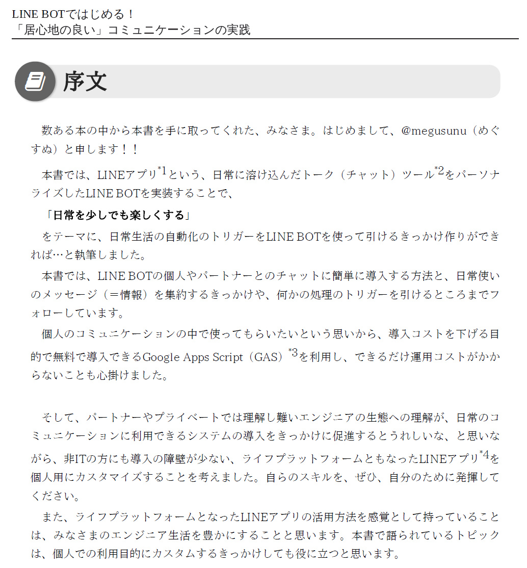 「日常を少しでも楽しくする」をテーマに、「LINE Messaging API」と「Google Apps Script」を使って個人用のLINE BOTを簡単に手軽に実装・運用するところまでを本書で紹介します。