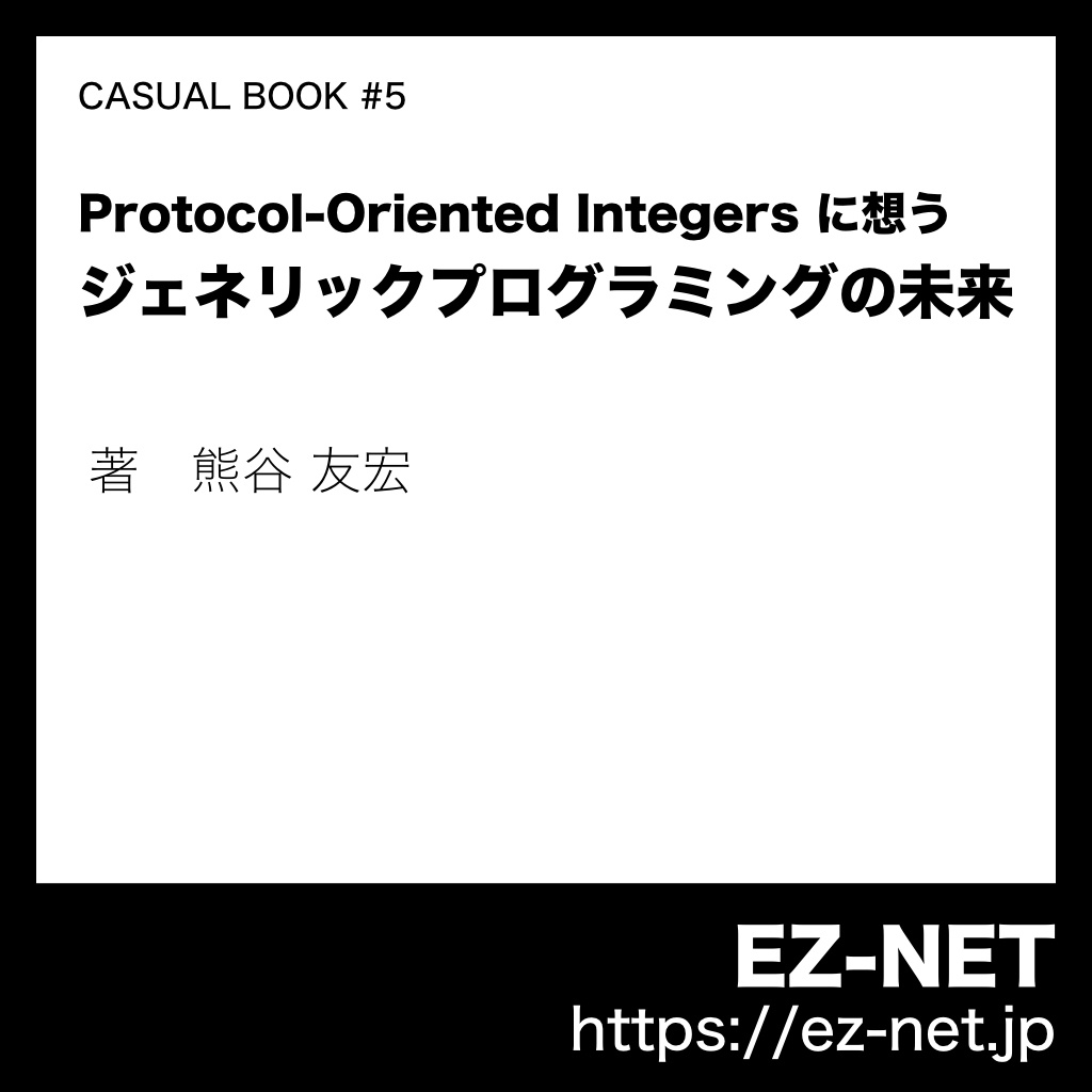Swift 4 で Protocol-Oriented Integers が登場し、プログラミングの在り方が新局面を迎えようとしているように感じます。特別だったジェネリクスの世界が日常的になるかもしれない。振り返れば Collection とか FloatingPoint とか、それを感じる場面って前から在ったんですよね。そんなことに想いを馳せながら Protocol-Oriented Integers が描く世界をみんなと眺めてみたくなりました。本書では、自分が Protocol-Oriented Integers に感じた印象を綴ります。それぞれ違う “感じ方” を一緒に楽しんでもらえたら嬉しいです。
